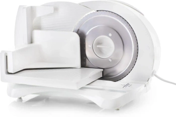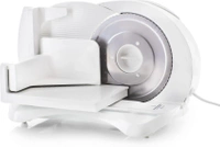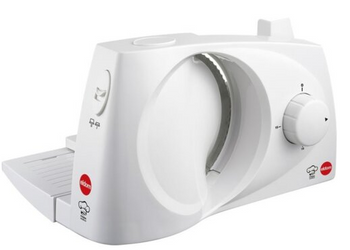 Białe Krajalnice Smapp o mocy 300 W, materiał obudowy - Tworzywo sztuczne, materiał noża - Stal nierdzewna. Posiadają regulację prędkości krojenia: Nie