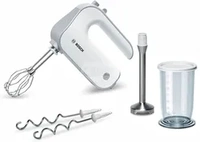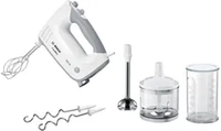 Białe Miksery ręczne Bosch o mocy 500 W, tryb pracy Turbo, Pulsacyjny, liczba poziomów obrotów: 5. Zestaw zawiera Końcowki do ubijania, Końcówka blendująca, Mieszadła